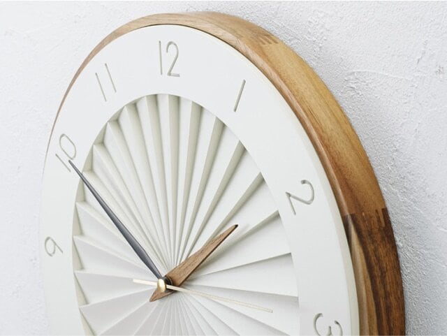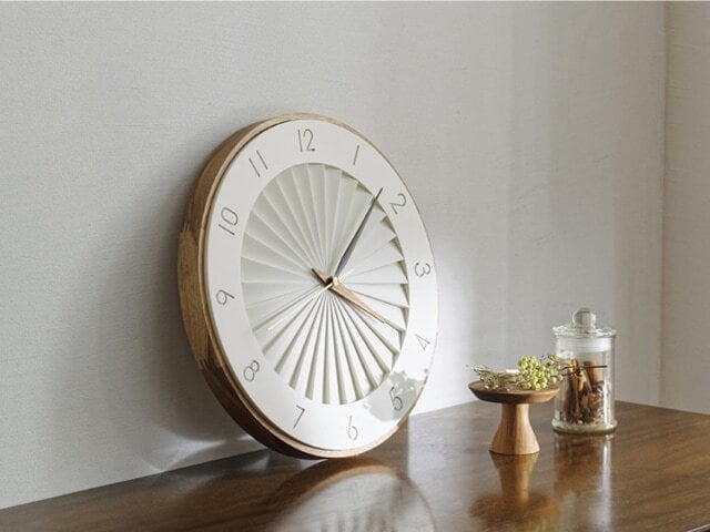 放射状に広がる段差が繊細な陰影を作り出すレリーフのような佇まいの掛け時計。