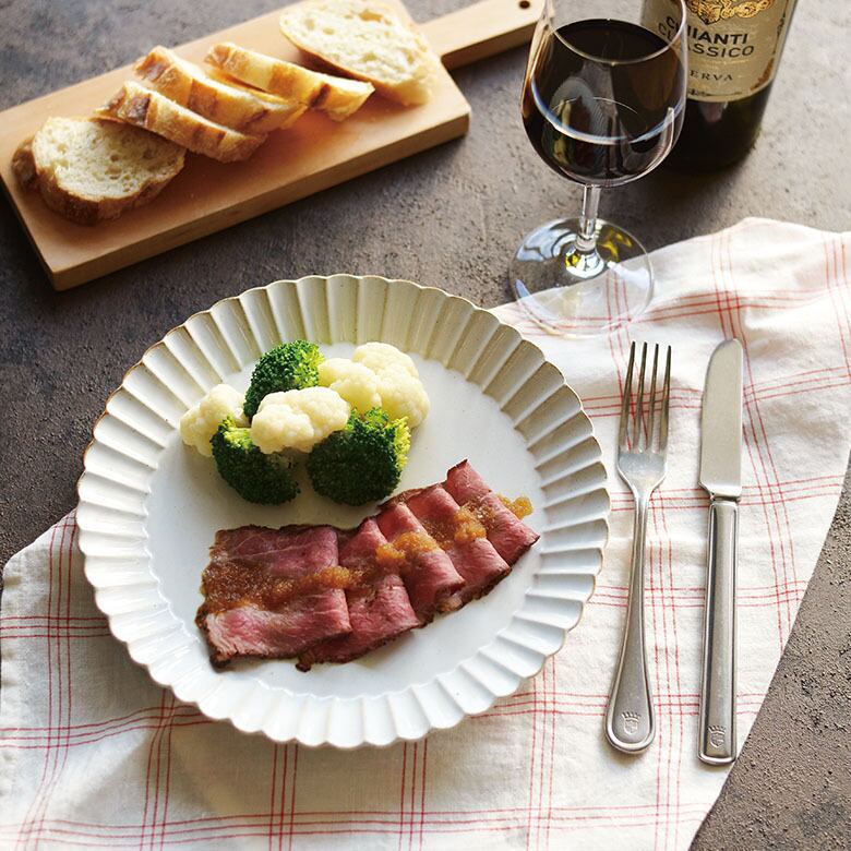 リムの部分は陶器素材である素地の赤土が透けて見え、表情がついているので1枚1枚に個性があります