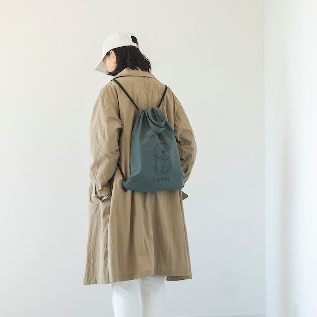 撥水・透湿防水加工のナイロン生地を使い、MAMBOをあしらった巾着型のトートバックです。