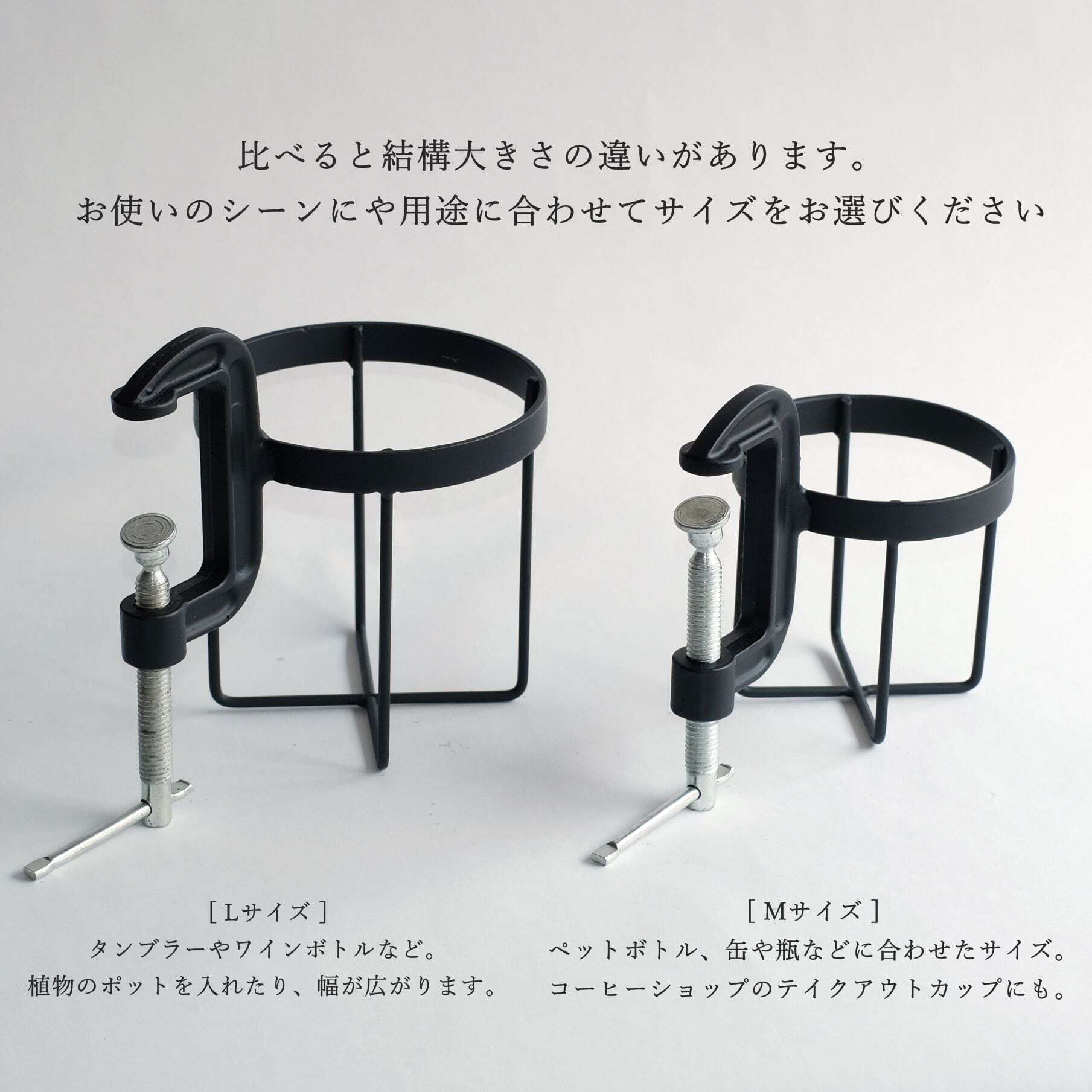 工具でお馴染みのCクランプにボトルホルダーを組み合わせ、テーブルや椅子のアームなどへ簡単に取り付けのできるWEST VILLAGE TOKYOオリジナルのボトルクランパー。