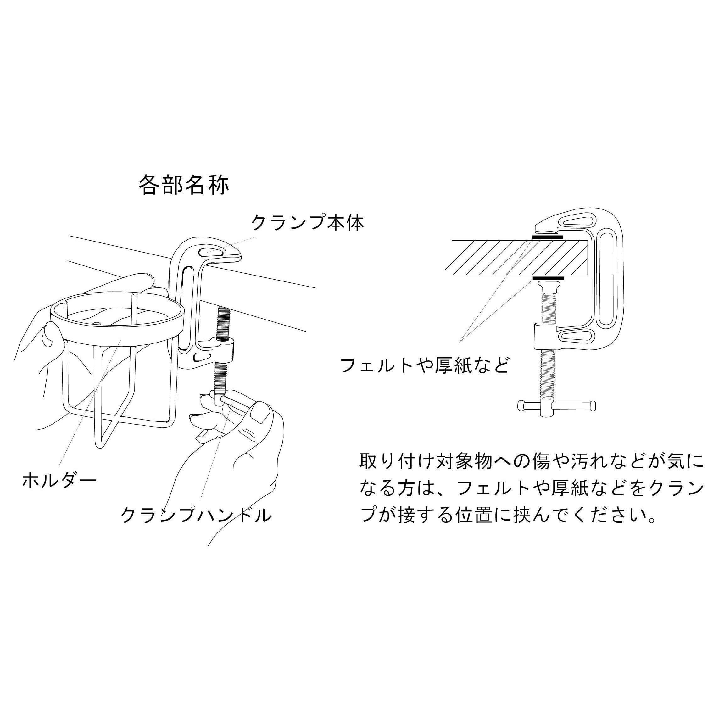 クランプを締め付ける際に対象物が木製や柔らかいものだと傷が付く場合がありますので、傷などが気になるようでしたらクランプの当たる部分にフェルトや厚紙などを挟んでご使用ください。